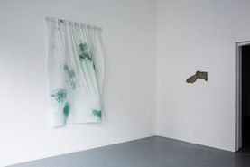 Dans cet espace baigné par la lumière que laisse passer la verrière, on observe la danse d’un tissu soufflé par le vent mais, à l’allure fantomatique tâché de vert-de-gris et figé dans le temps. La sculpture murale J’ai froid installée sur le mur à ses côté lui répond en clin d’œil. À l’image d’une serviette abandonnée sur son portant, la pièce Sculpter des cascades, située en plein milieu de l’espace, retranscrit l’évocation de la puissance plastique de l’eau. L’eau change de forme en permanence, elle est par excellence la forme de l’impermanence. La photographie a été prise par l’artiste à Mortain, ville située à une trentaine de kilomètres de Flers où se trouvent deux idylliques cascades.